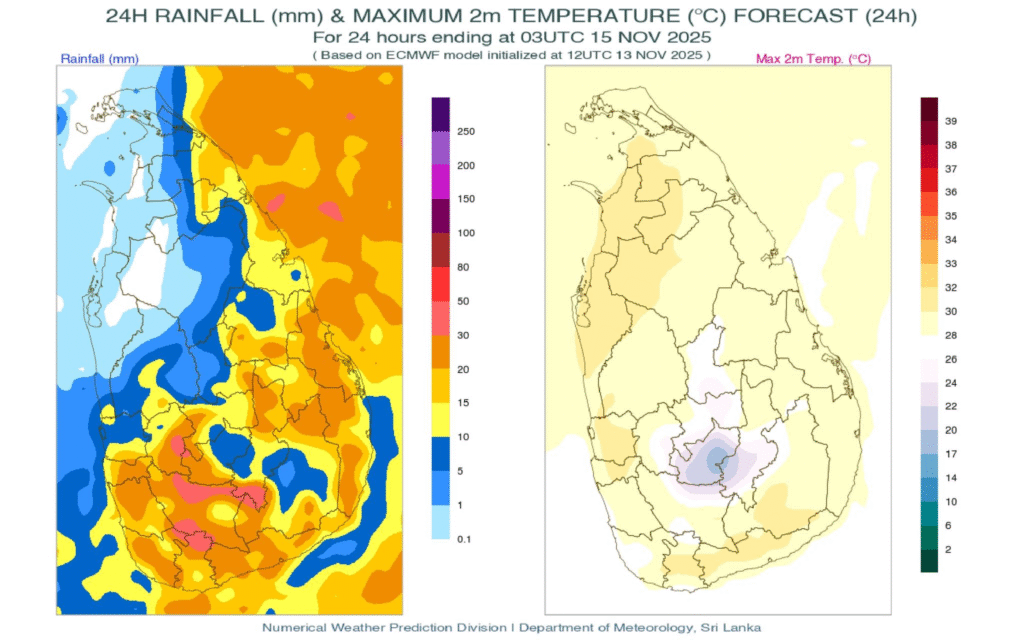 ඒ අනුව, අද (නොවැම්බර් 14) දිනයේදී උතුරු, උතුරු-මැද, නැගෙනහිර සහ ඌව පළාත්වලත් හම්බන්තොට දිස්ත්රික්කයේත් විටින් විට වැසි ඇතිවේ.