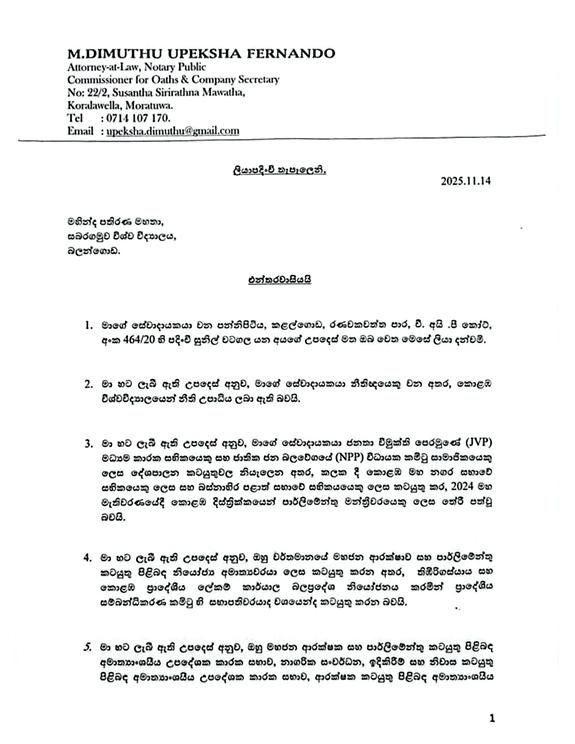 ඒ, මහින්ද පතිරණ නැමැත්තෙකු විසින් 2025 සැප්තැම්බර් මාසයේදී පල කරන ලද ෆේස්බුක් වීඩියෝවක් මඟින් බව සඳහන් වේ.
