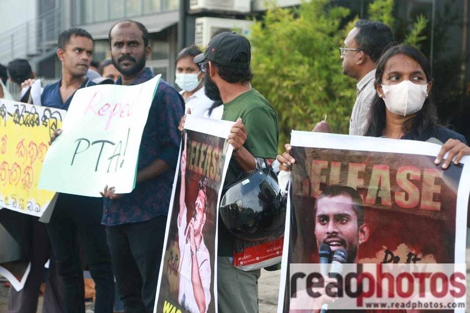 ත්‍රස්තවාදය වැළැක්වීමේ පනත යටතේ රඳවා සිටින විශ්වවිද්‍යාල ශිෂ්‍ය බලමණ්ඩලයේ කැඳවුම්කරු වසන්ත මුදලිගේ සහ විශ්වවිද්‍යාල භික්ෂු බලමණ්ඩලයේකැඳවුම්කරු සිරිධම්ම හිමියන් නිදහස් කරන ලෙස බලකරමින් අද (15)දින සවස නාරාහේන්පිට ත්‍රස්ත විමර්ශන ඒකකය ඉදිරිපිටදී උද්ඝෝෂණ ව්‍යාපාරයක් පැවැත්විනි.