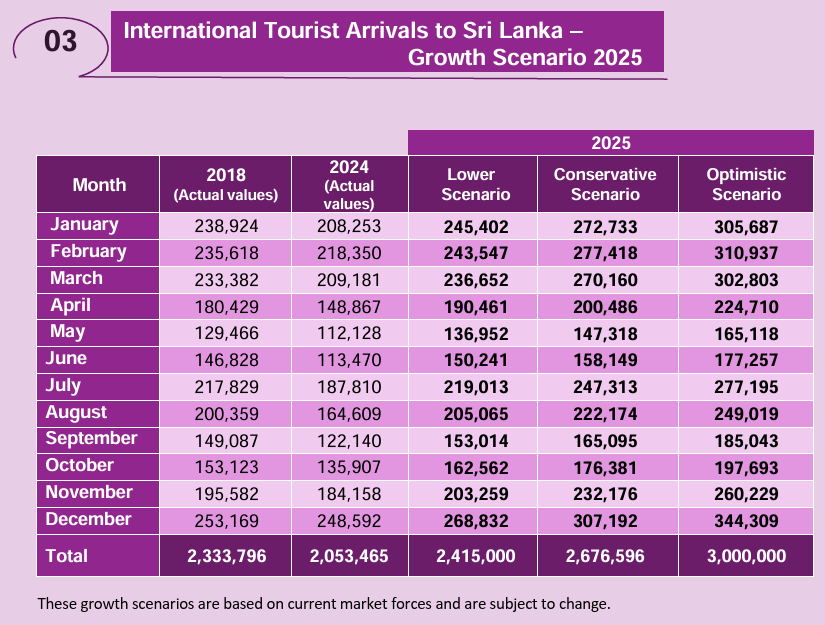 ශ්‍රී ලංකා සංචාරක සංවර්ධන අධිකාරිය විසින් සලකා තිබෙන්නේ මෙම වසරේ ආර්ථික වර්ධන වේගය 3.5%ක් වනු ඇති වුවද, ඉදිරි 2026 වසරේදී ආර්ථික වර්ධන වේගය 3.1%ක් දක්වා අඩු වනු ඇති බවයි. රටේ දිගුකාලීන ආර්ථික වර්ධන වේගය 3.1% මට්ටමට වඩා වැඩි කර ගැනීමේ උත්සාහය තුළ දැනට වැඩිම බරක් තබා තිබෙන්නේ සංචාරක කර්මාන්තය මත බැවින් සංචාරක පැමිණීම ඉලක්ක මට්ටමට වඩා බොහෝ අඩු වීම අවධානය යොමු විය යුතු කරුණක්.