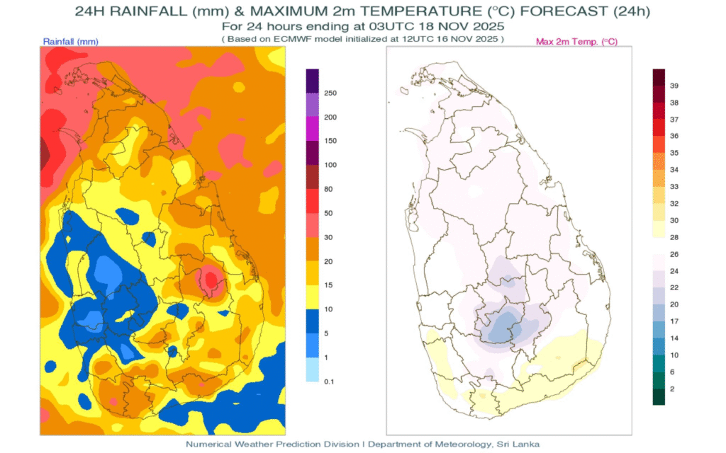 ඒ අනුව, අද (නොවැම්බර් 17) දිනයේදී උතුරු, උතුරු-මැද, නැගෙනහිර සහ ඌව පළාත්වලත් හම්බන්තොට දිස්ත්‍රික්කයේත් විටින් විට වැසි හෝ ගිගුරුම් සහිත වැසි ඇති වේ.