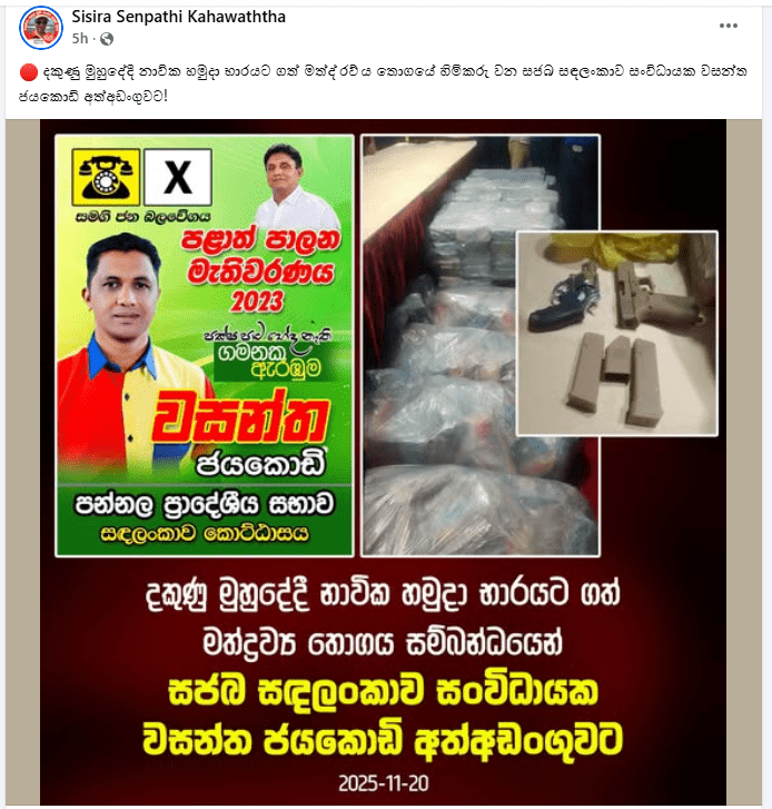 ඊයේ (20) දිනයේදී දකුණු මුහුදු තීරයේදී මත්ද්රව්ය තොගයක් සමග ධීවර යාත්රාවක් අත් අඩංගුවට ගැනීමේ සිද්ධියට අදාළව සමගි ජන බලවේගයේ පළාත් පාලන මැතිවරණ අපේක්ෂකයකු පොලිස් මත්ද්රව්ය නාශක කාර්යාංශය විසින් අත් අඩංගුවට ගෙන තිබේ.