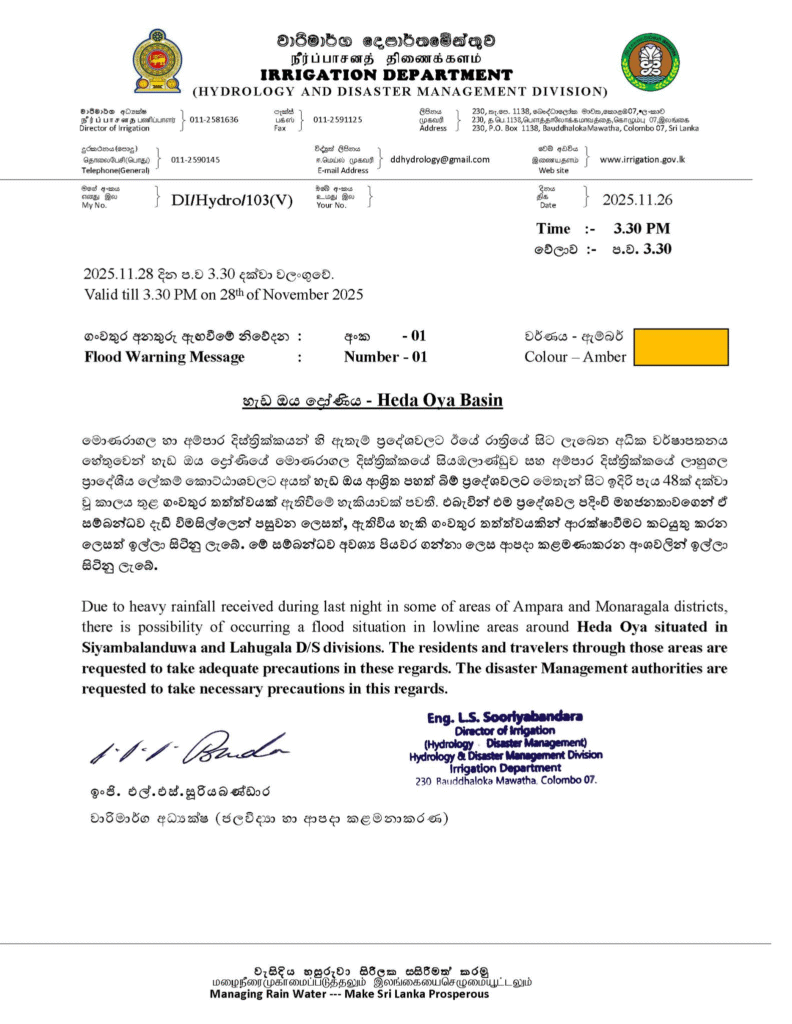 හැඩ ඔය ද්රෝණියේ මොනරාගල දිස්ත්රික්කයේ සියඹලාණ්ඩුව සහ අම්පාර දිස්ත්රික්කයේ ලාහුගල ප්රාදේශීය ලේකම් කොට්ඨාසවලට අයත් හැඩ ඔය ආශ්රිත පහත් බිම්වලට ඉදිරි පැය 48 ඇතුළත ගංවතුර තත්වයක් ඇතිවීමේ හැකියාවක් පවතින බව වාරිමාර්ග දෙපාර්තමේන්තුව පවසයි.