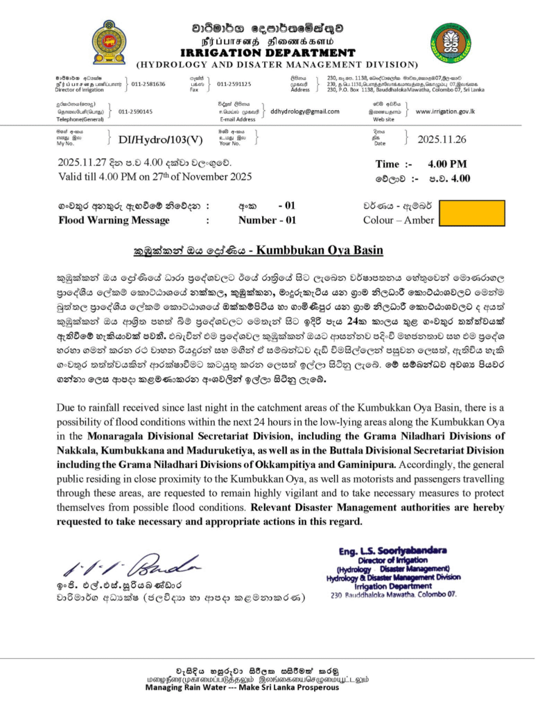 එසේම කුඹුක්කන් ඔය ද්රෝණියේ ධාරා ප්රදේශවලට ලැබෙන අධික වර්ෂාපතනය හේතුවෙන් මොනරාගල ප්රාදේශීය ලේකම් කොට්ඨාසයේ නක්කල, කුඹුක්කන, මාදුරුකැටිය යන ග්රාම නිලධාරී කොට්ඨාසවලට මෙන්ම බුත්තල ප්රදේශීය ලේකම් කොට්ඨාසයේ ඔක්කම්පිටිය හා ගාමිණීපුර යන ග්රාම නිලධාරී කොට්ඨාසවලට අයත් කුඹුක්කන් ඔය ආශ්රිත පහත් බිම්වලට ඉදිරි පැය 24 තුළ ගංවතුර තත්වයක් ඇතිවීමේ අවදානමක් පවතින බවත් එම දෙපාර්තමේන්තුව නිවේදනය කර ඇත.