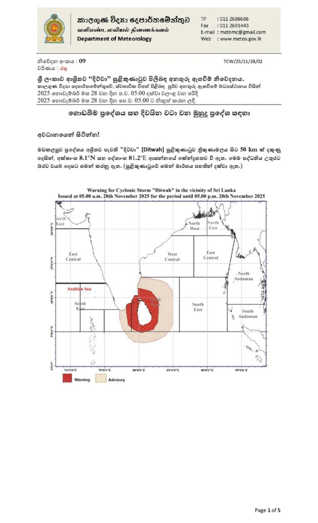 “දිට්වා” සුළිකුණාටුව ත්‍රිකුණාමලයට කිලෝමීටර් 50ක් දකුණෙන් – අද (28) අලුයම නිකුත් කෙරුණු රතු නිවේදනය මෙන්න !