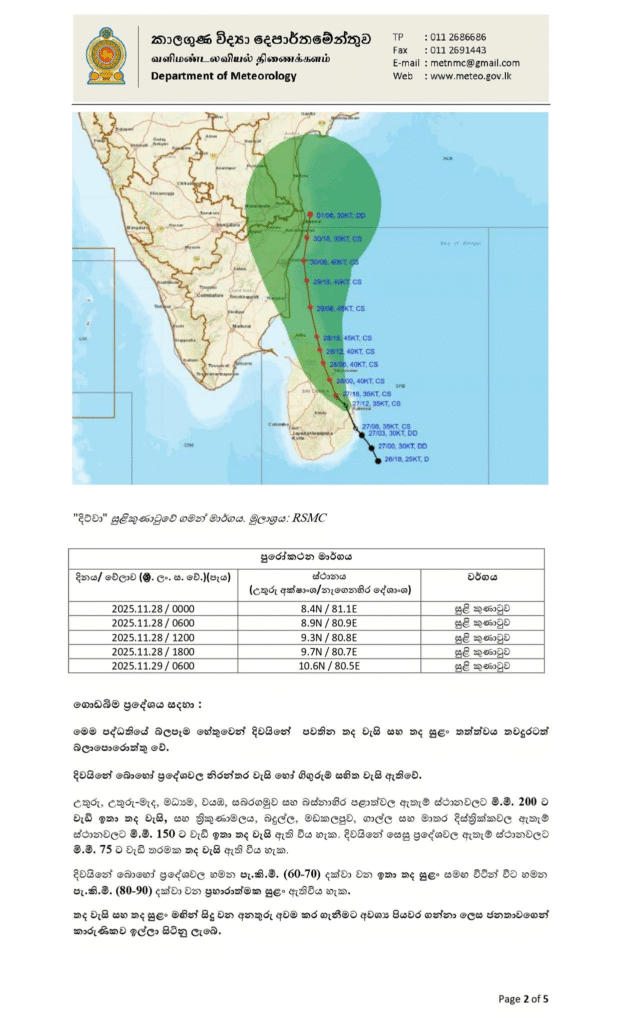 මඩකලපුවට කි.මී. 20ක් නිරිත දෙසින් හමාගිය ‘දිට්වා’ සුළි කුණාටුව මේ වනවිට ත්‍රිකුණාමලයට කි.මී. 50ක් දකුණු දෙසින් කේන්ද්‍රගතව පවතින බව කාලගුණ විද්‍යා දෙපාර්තමේන්තුව පවසයි.