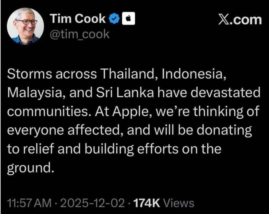 Apple සමාගමේ ප්රධාන විධායක නිලධාරී (CEO) ටිම් කුක් මහතා විසින්, ශ්රී ලංකාව ඇතුළු ආසියානු රටවල් කිහිපයකට බලපෑ දරුණු කුණාටු තත්ත්වය හේතුවෙන් විපතට පත් ප්රජාවන් සඳහා සහන සහ ඉදිකිරීම් කටයුතු වෙනුවෙන් ආධාර ලබා දීමට පොරොන්දු වී ඇත.