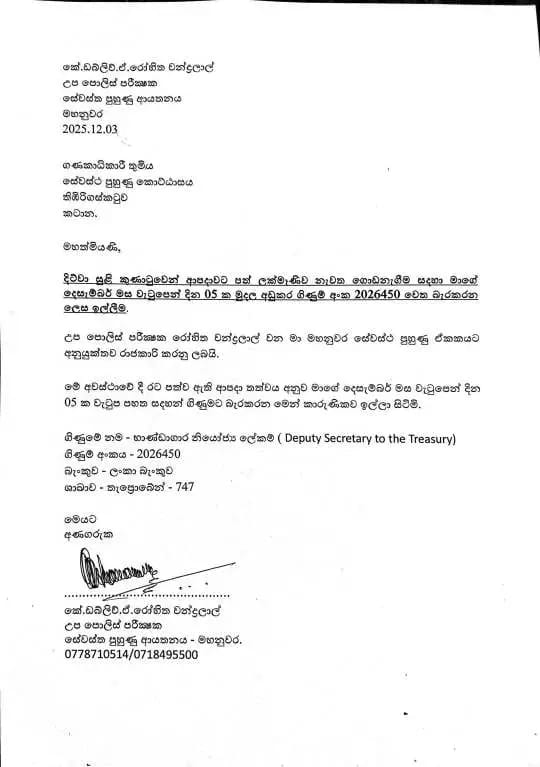 ඒ තම මාසික වැටුපෙන් දින පහක වැටුප් ප්‍රමාණයක් ආපදාවෙන් අසරණ වූ ජනතාවට ලබාදීමට එම උප පිරිස් පරීක්ෂකවරයකවරයා තීරණය කර තිබීමයි.