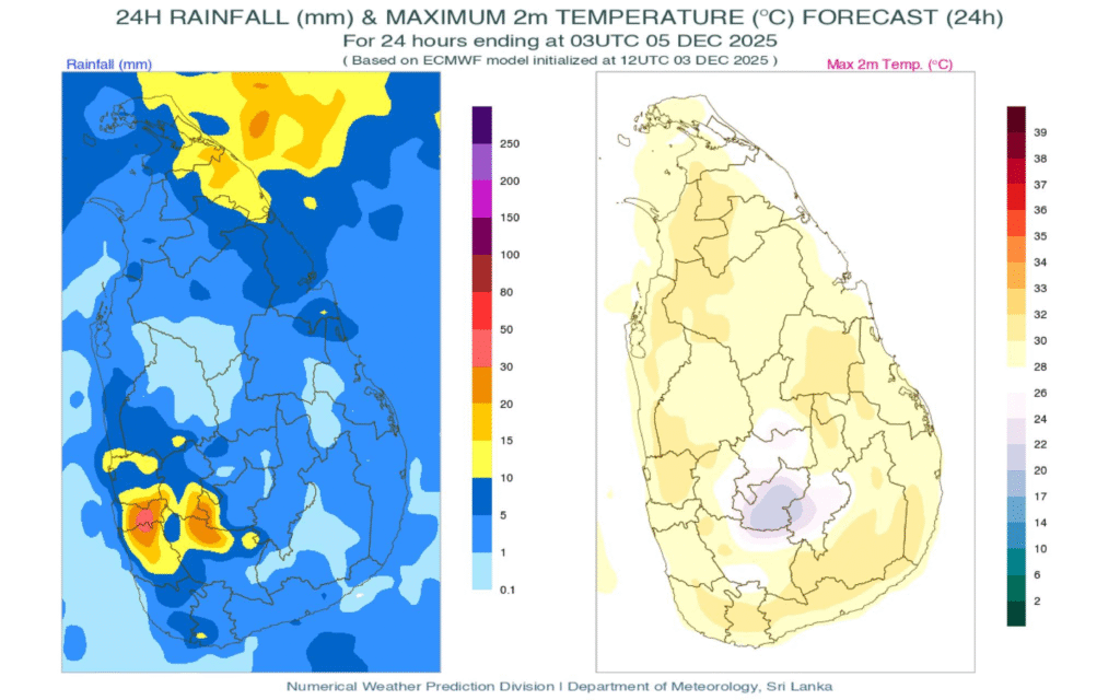අද (දෙසැම්බර් 04) දිනයේදී උතුරු, උතුරු-මැද, නැගෙනහිර සහ ඌව පළාත්වලත් හම්බන්තොට සහ මාතලේ දිස්ත්රික්කවලත් වැසි වාර කිහිපයක් ඇතිවන බව කාලගුණ විද්යා දෙපාර්තමේන්තුව පවසයි.