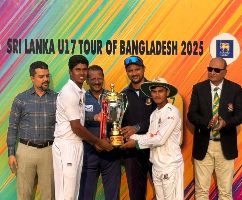 බංගලාදේශයේ සංචාරයක යෙදෙන ශ්‍රී ලංකා අවුරුදු 17 න් පහළ කණ්ඩායම පළමු තුන්දින තරගයෙන් පරාජයට පත් වුව ද,දෙවන තරගය කඩුලු 9 න් ජය ගනිමින් තරගාවලිය 1-1 ක් ලෙස සම කර ගන්නට සමත් වුණා.ඒ සඳහා කොළඹ රාජකීය විද්‍යාලය නියෝජනය කරමින් ශ්‍රී ලංකා කණ්ඩායමට එකතු වූ නායක රෙහාන් පීරිස් පිත්තෙන් මෙන්ම එම විද්‍යාලය හරහා කණ්ඩායමට පැමිණි හිමරු දේශාන් පන්දුවෙන් ද දැක් වූ දස්කම් කැපී පෙණුනා.