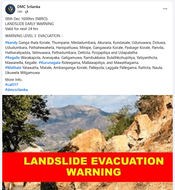 ඒ අනුව, එම රතු නිවේදනයේ සඳහන් මහනුවර, කෑගල්ල, කුරුණෑගල සහ මාතලේ යන දිස්ත්රික්වල අදාළ ස්ථානවල සිටින ජනතාව දෙසැම්බර් මස 9 වනදින සිට 19 වන දින දක්වා කාලය තුළ සුරක්ෂිත මධ්යස්ථාන වෙත යොමුකරන ලෙස ආපදා කළමනාකරණ මධ්යස්ථානය දිස්ත්රික් ලේකම්වරුන්ට දැනුම් දී ඇත.