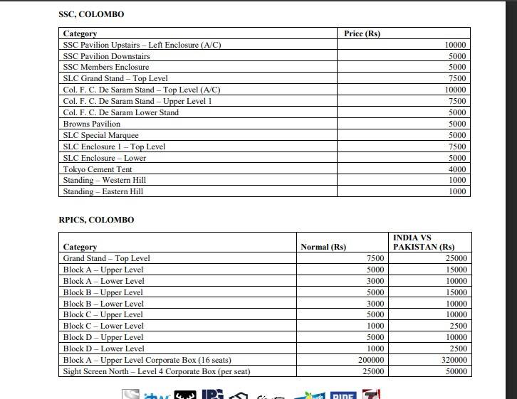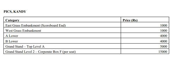 ප්රේමදාස,එස්එස්සී සහ පල්ලෙකැලේ යන ඒ ඒ ක්රීඩා පිටිවලට අදාළව සම්පූර්ණ ප්රවේශ පත්ර මිල ගණන් මේ සමඟ දක්වා ඇති අතර පහතින් දක්වා ඇත්තේ මාර්ගගත ක්රමයට ප්රවේශ පත්ර මිලදී ගැනීමට හැකි සබැඳියය.
