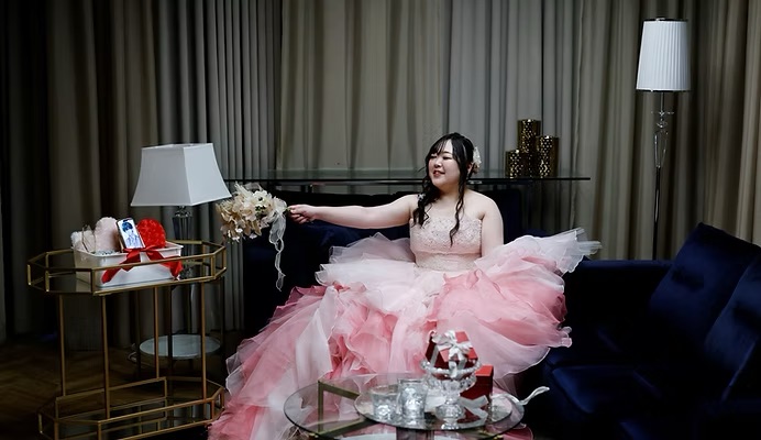 සමාජ මාධ්‍ය ඔස්සේ බෙදා ගන්නා ලද වීඩියෝවක, නොගුචි විචිත්‍රවත් බෝල්ගවුන් මංගල ඇඳුමක් ඇඳගෙන රෝස සහ සුදු මල් කළඹක් අල්ලාගෙන වර්ඩුරේ වෙත ළඟා විය. නොගුචි විසින් ක්ලවූස්ට පරිගණකගත හඬක් පවරා නොතිබූ නිසා, මනාලයාගේ පොරොන්දු විවාහ සැලසුම්කරු වන නාඕකි ඔගසවරා හරහා කියවන ලදී. ස්මාර්ට්ෆෝන් තිරයක් හරහා පෙනී සිටි ක්ලවුස් සමඟ පොරොන්දු හුවමාරු කර ගැනීම සඳහා වැඩි දියුණු කළ රියැලිටි ස්මාර්ට් දර්පණයක් ඇය භාවිතා කළාය.