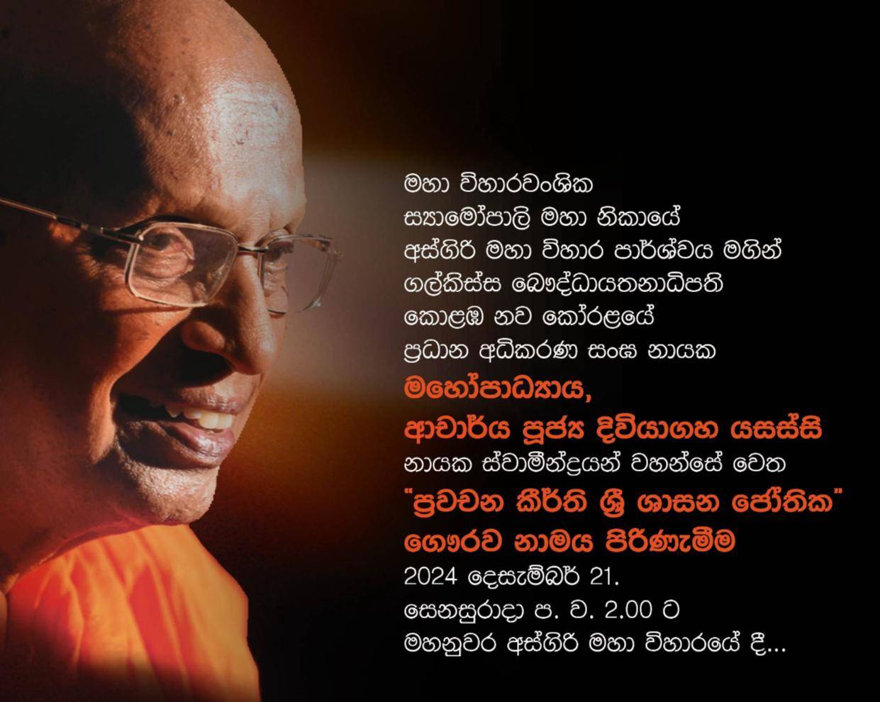 ස්විට්සර්ලන්තය (LNW) : සිය වසක් ලබන්නට තව වසර දහයක් තිබියදී තම පැවිදි දිවියේ සාඩම්බර මහිමය නිහතමානිව ලොවට ප්රකට කරමින් සියලු අංශ වලින් පරිපුර්ණ, කෝණයකින් ගණනය කළ නොහැකි අපමණ ජාතික ආගමික අධ්යාපනික සාමාජික හා ශාසන සේවාවකට තම ජීවිතයම කැපකළ, ගල්කිස්ස බෞද්ධායතනාධිපති කොළඹ ආනන්ද මහා විද්යාලයේ හිටපු සහකාර විදුහල්පති, ත්රිපිටකවාගිශ්වරාචාර්ය උපාධ්යාය පුජ්යපාද දිවියාගහ යසස්සි නාහිමියන්, සියම් මහා නිකායේ අස්ගිරි මහා විහාරයීය ශ්රීමත් මහානායක සානුනායක වරප්රමුඛ විoශත් වාර්ගික කාරක මහා සංඝ සභාව මගින් -ප්රවචන කිර්ති ශ්රී සද්ධම්මජෝතික- යන බෙහෙවින්ම අර්ථවත්වූ ගෞරව නාමයෙන් උපහාර පැවැත්වීම සැබවින්ම පිදිය යුත්තන් පිදීමේ මහඟු ගුණය අපට සිහිපත් කරවති.ඒනිසාම එම ගෞරවනීය පදවියෙන් උන්වහන්සේ පුජනීයත්වයට පත් කිරීම අස්ගිරි මහා විහාරය මගින් සිදු කළ කාලෝචිත සම්භාවනීය පියවරක් ලෙස එම කීර්තිමත් සංඝ සභාවට බෞද්ධලොකයේම කෘතවේදී ප්රශංසාවද ගෞරවයද සාකල්යයෙන්ම හිම්විය යුතුමය.