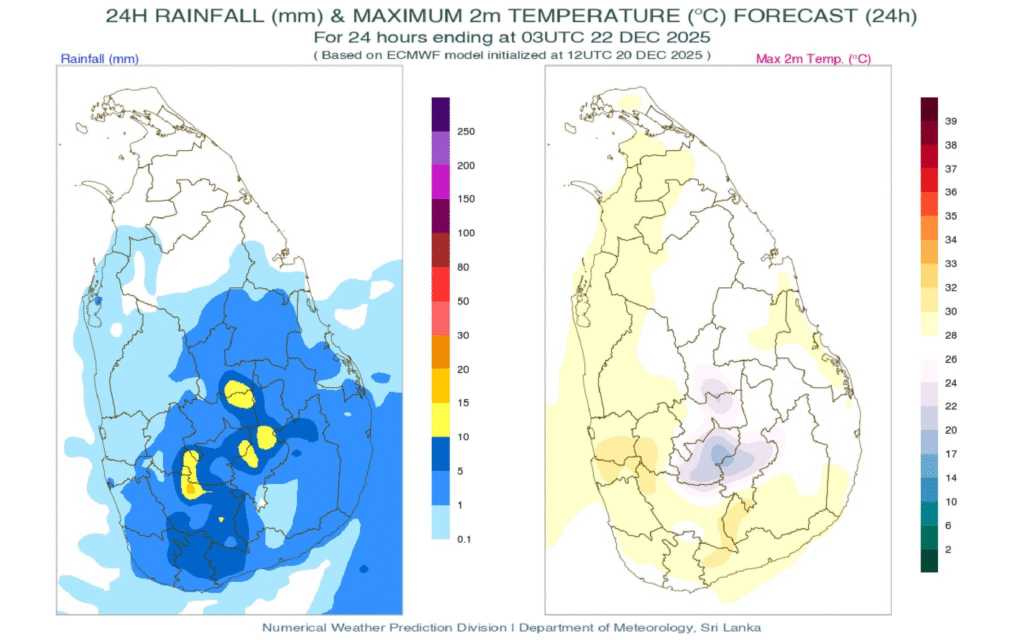 අද (දෙසැම්බර් 21) දිනයේදී නැගෙනහිර, ඌව සහ මධ්‍යම පළාත්වලත් පොලොන්නරුව සහ හම්බන්තොට දිස්ත්‍රික්කවලත් වැසි වාර කිහිපයක් ඇතිවන බව කාලගුණ විද්‍යා දෙපාර්තමේන්තුව පවසයි.