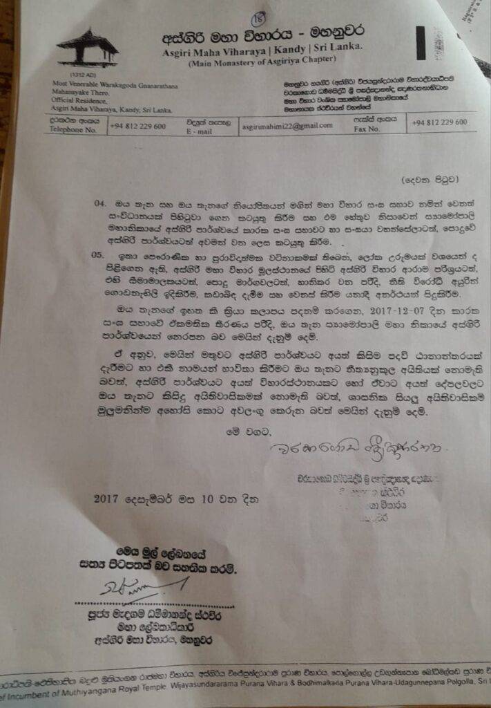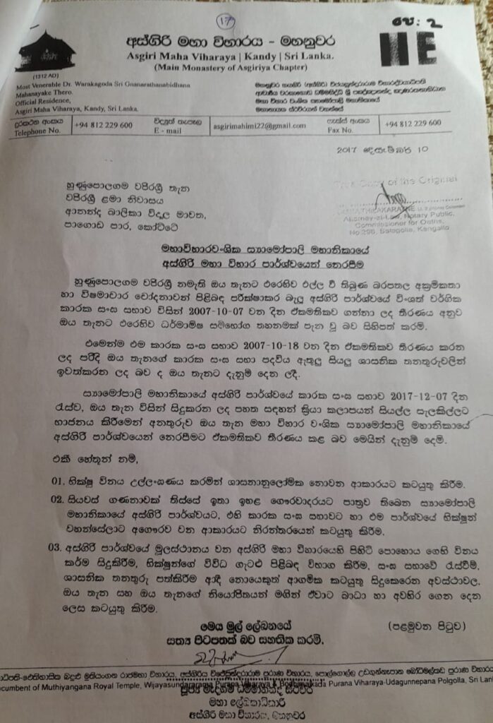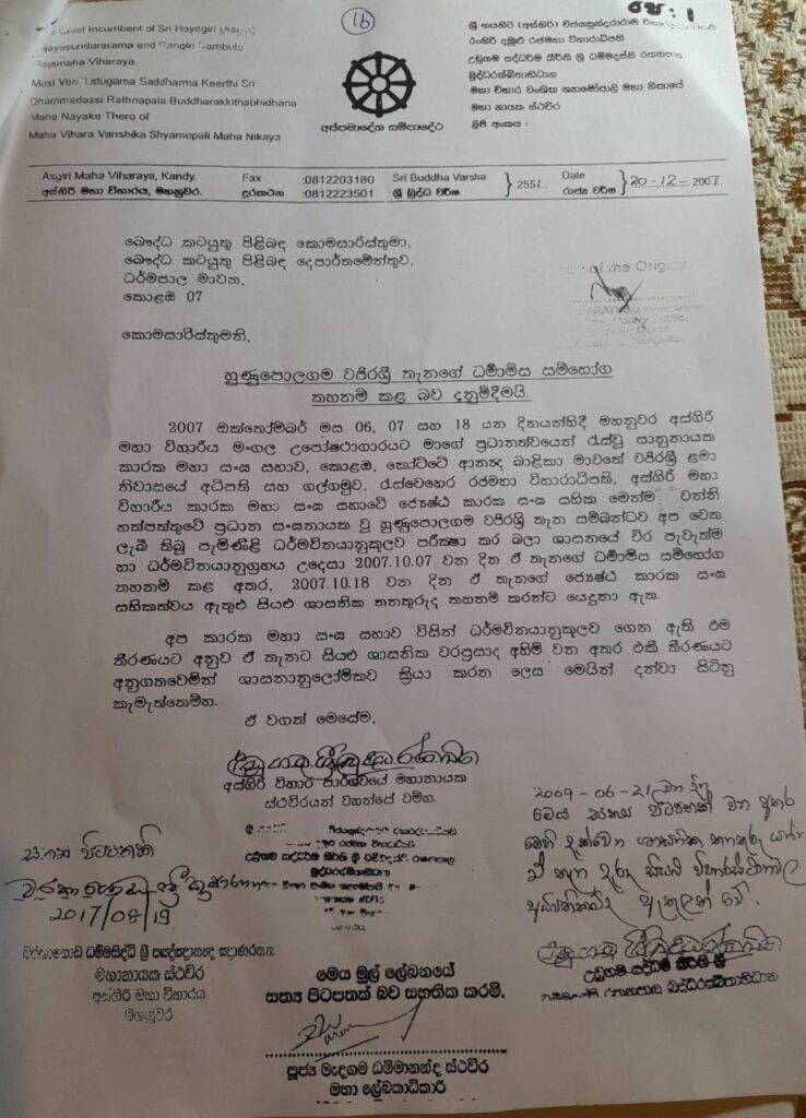 මහජනතාවගේ භක්තිය පාවිච්චි කරමින් මුදල් උපයමින් පවුල නඩත්තු කරන මෙම පුද්ගලයාව වහාම ශාශනයෙන් නෙරපා හරින ලෙසත්, උපැවිදි කරන ලෙසත් ඉල්ලා ඔහු මෙම පැමිණිල්ල ඉදිරිපත් කර ඇත. තිරිසන් ලිංගික සබදතා පවත්වන අයෙකු වන වජිර ශ්‍රී නමින් පෙනීසිටින මෙම තැනැත්තාගේ අකටයුතුකම් නැවත්වීමට වහාම මැදිහත් වන ලෙසට කැලුම් අමරසිංහ විසින් පරීක්ෂණයක් ඉල්ලා ඇත.