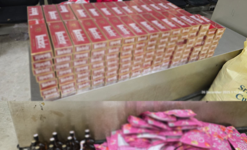 සැකකරුවන් විසින් රැගෙන ආ ගමන් මලු තුළ විදේශීය නිෂ්පාදිත දුම්වැටි 44,000ක් අඩංගු දුම්වැටි කාටූන් 220ක් , විදේශීය මත්පැන් බෝතල් 19ක් , රූපලාවන්ය කටයුතු සඳහා භාවිතා කරන , සෞඛ්ය අමාත්යංශයේ සහ ජාතික ඖෂධ නියාමන අධිකාරියේ අවසරය නොමැති ” කොලැජන් ” පැකැට් 430ක් සහ තවත් පාවහන් සහ වෙළෙද භාණ්ඩ රාශියක් ද රේගු නිලධාරීන් භාරයට ගෙන තිබෙන බව සඳහන් වේ.