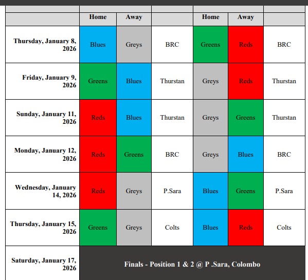 මේ සමඟ ජනවාරි 8 වන දා සිට 17 වන දා දක්වා තරග පැවත්වෙන තරග කාල සටහන දක්වා ඇති අතර එහිදී එම කණ්ඩායම් තරග වඳින ආකාරය මෙන්ම තරග වඳින ස්ථානය ද දක්වා තිබෙනවා.