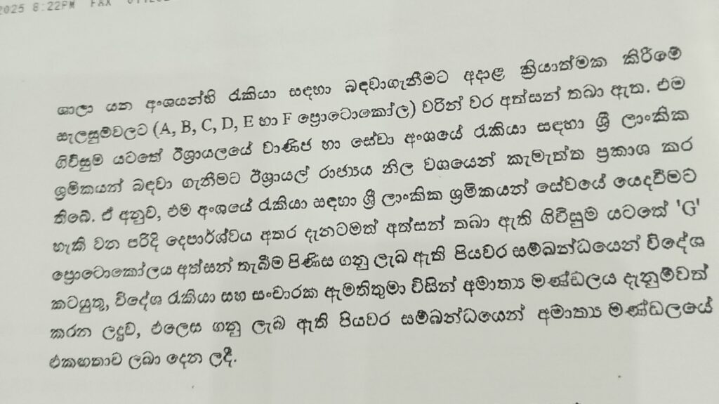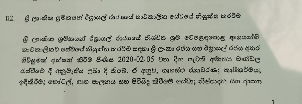 ශ්‍රී ලාංකිකයින්ට නැවතත් ඊශ්‍රායල් රාජ්‍යයේ තාවකාලිකව සේවයේ නියුක්ත කරවීම මඟින් නව රැකියා අවස්ථා අවස්ථා සඳහා ප්‍රවේශයයක් ලබා ගැනීමට ශ්‍රී ලංකා රජය සහ ඊශ්‍රායල් රජය අතර ගිවිසුමක් අත්සන් තැබීමට කැබිනට් අනුමැතිය ලැබී ඇත .