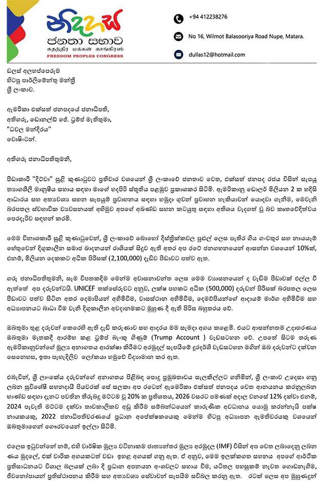 ඇමෙරිකානු ජනාධිපති ඩොනල්ඩ් ට්‍රම්ප් වෙත , හිටපු අමාත්‍ය ඩලස් අලහප්පෙරුම මහතා විසින් ඉල්ලීමක් කරමින් ලිපියක් යවා ඇත.