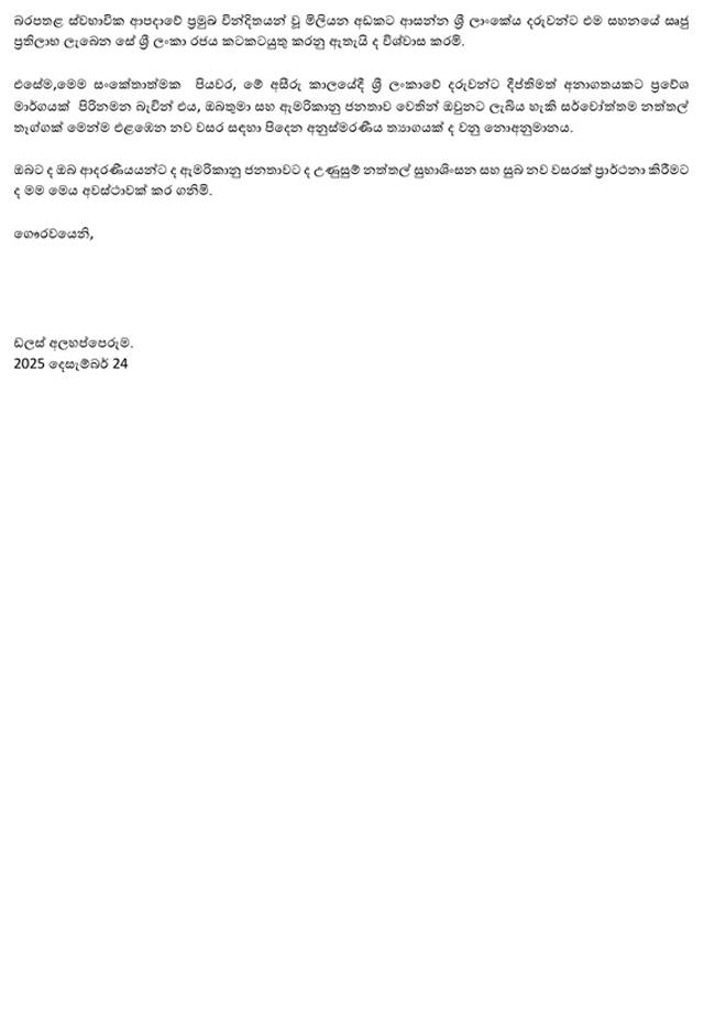 පීඩාකාරී “දිට්වා” සුළි කුණාටුවට ප්‍රතිචාර වශයෙන් ශ්‍රී ලංකාවේ ජනතාව වෙත, එක්සත් ජනපද රජය විසින් සැපයූ ත්‍යාගශීලී මානුෂීය සහාය සඳහා මාගේ හදපිරි ස්තූතිය පළමුව ප්‍රකාශකර සිටිමි. ඇමරිකානු ඩොලර් මිලියන 2 ක හදිසි ආධාරය සහ අත්‍යවශ්‍ය සහන සැපයුම් ප්‍රවාහනය සඳහා හමුදා ගුවන් ප්‍රවාහන හැකියාවන් යොදවා ගැනීම, මෙවැනි බරපතල ස්වභාවික ව්‍යවසනයක් අභිමුව අපගේ අඛණ්ඩ සහන කටයුතු සඳහා අතිශය වැදගත් වූ බව කෘතවේදිත්වය පෙරදැරිව සඳහන් කරමි.